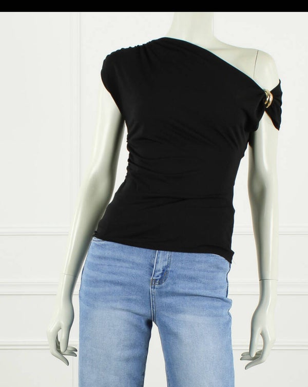 Trendy getailleerde top met goudkleuring derail op de schouder. Deze jonge top kan off shoulder gedragen worden. Dit model heeeft veel stretch.